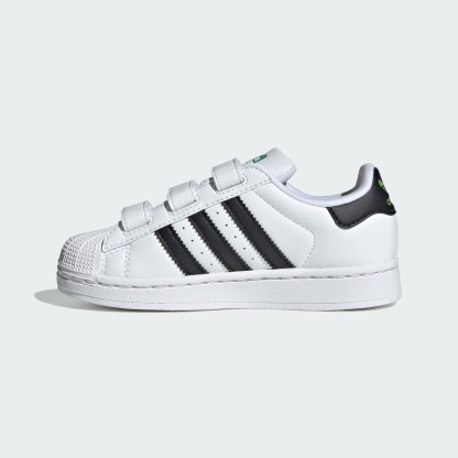 These kids' adidas Superstar shoes are inspired by Disney Pixar's "Up." With their iconic shell toe and serrated 3-Stripes design, the adidas Superstar shoes have been making a comeback on playgrounds and schoolyards for over 50 years. Featuring hook-and-loop straps, these shoes are easy for little hands to put on and kick off. The smooth synthetic leather upper, textile lining and rubber outsole keep kids comfortable whether they're climbing jungle gyms or chasing their friends around the park.
