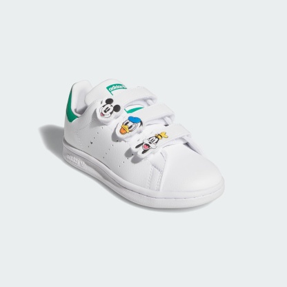 This version of the legendary Stan Smith tennis shoes from adidas Originals are sized for young fans. The hook-and-loop straps make them easy to pull on and off, while Disney's Mickey and Friends graphics bring the magic of their favourite characters. The synthetic leather upper is easy to keep clean, and the rubber outsole grips the ground.