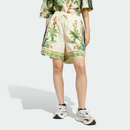 Desert vibes meet sporty elegance with these adidas shorts. Designed in collaboration with FARM Rio, they combine the best of both worlds to create a versatile silhouette that can be worn everywhere from stadiums to dance venues. The loose fit and elastic waist make them super comfortable, while the smooth nylon fabric offers a sleek, stylish drape. Pair them with sandals or sneakers, either way, your look is sure to grab some attention.