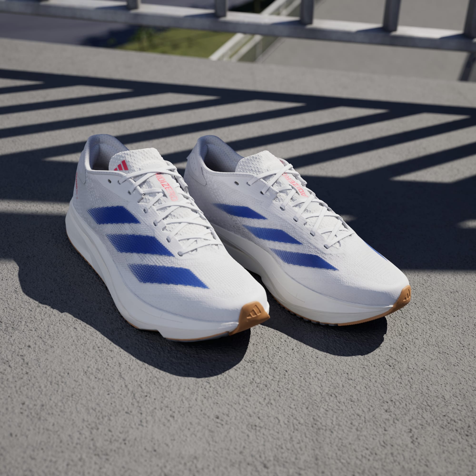 Experience the thrill of breaking personal records in a shoe that's as fast as you are. These adidas Adizero running shoes are equipped with responsive Lightstrike Pro, super-light cushioning that delivers energy return for next-level speed. The engineered mesh upper provides breathability and targeted support where you need it most to keep you flying to the finish. This product features at least 20% recycled materials. By reusing materials that have already been created, we help to reduce waste and our reliance on finite resources and reduce the footprint of the products we make.