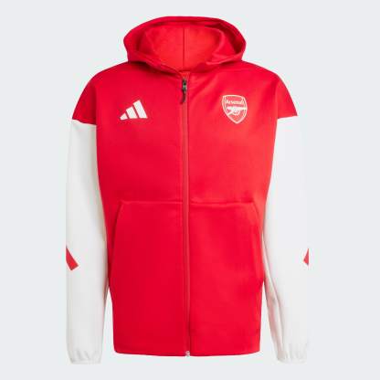 Ready for anything. The adidas Z.N.E. design of this Arsenal anthem jacket makes it the ideal top to zip up when you're preparing to shine. Its roomy hood and soft doubleknit fabric keep the club's players relaxed when they're lining up before big soccer games. A team badge on the chest and "Arsenal" wording on the top of the hood let you show your passion for the Gunners.