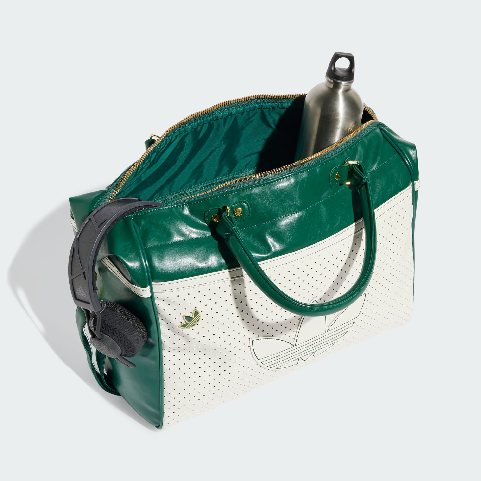 This bowling bag from adidas combines fashion with function to keep you organized when you're on the go. It's all about versatility with an adjustable and detachable shoulder strap, extra bags that can be attached or removed depending on needs and the shape you want to vibe with your look. A mix of perforated and crinkled faux leather gives it a glossy, premium look and feel, while the pair of Trefoils — one applied, the other a metallic pin — add an authentic touch. Contrast piping and metal hardware finish the look, and a webbing shoulder strap makes it easy to carry.