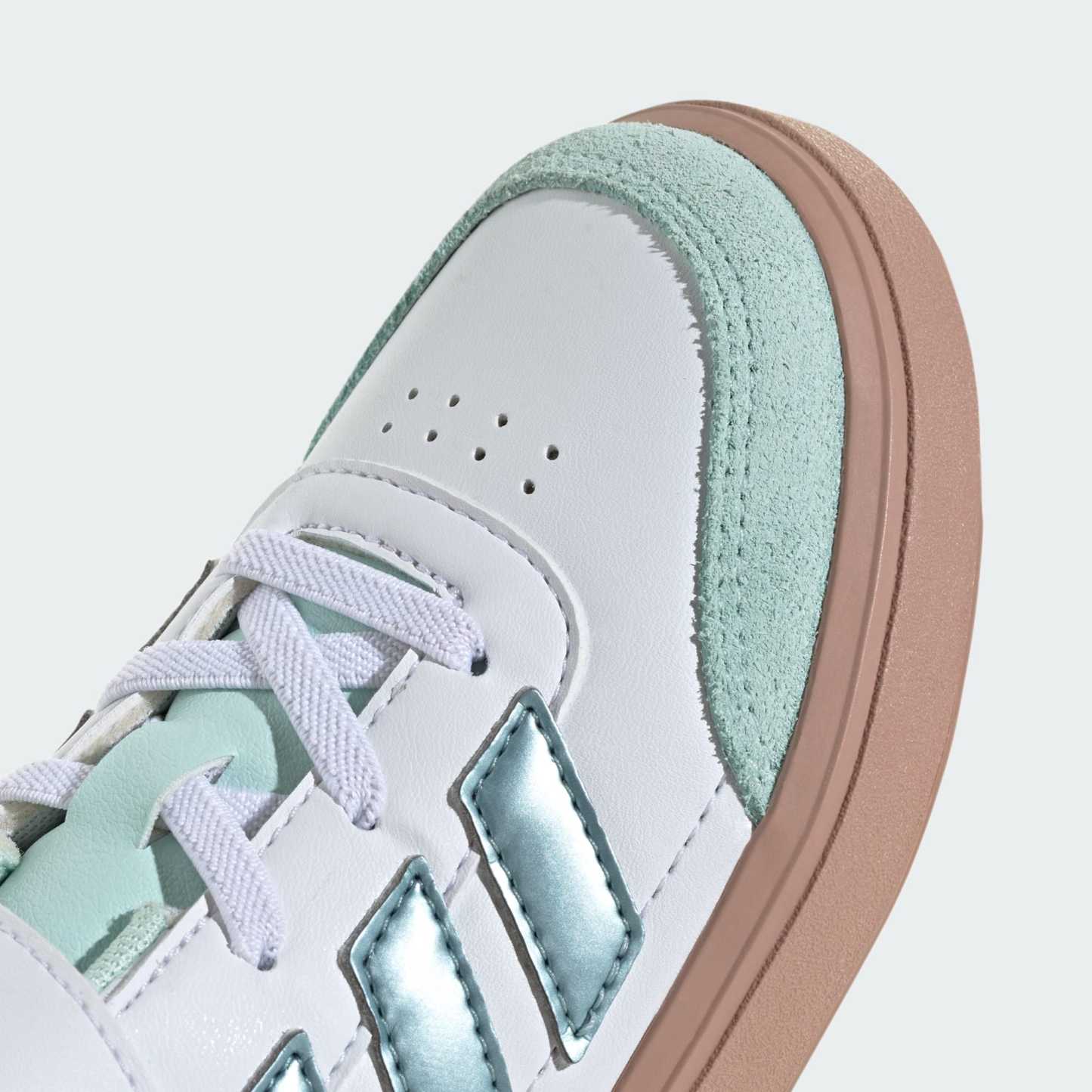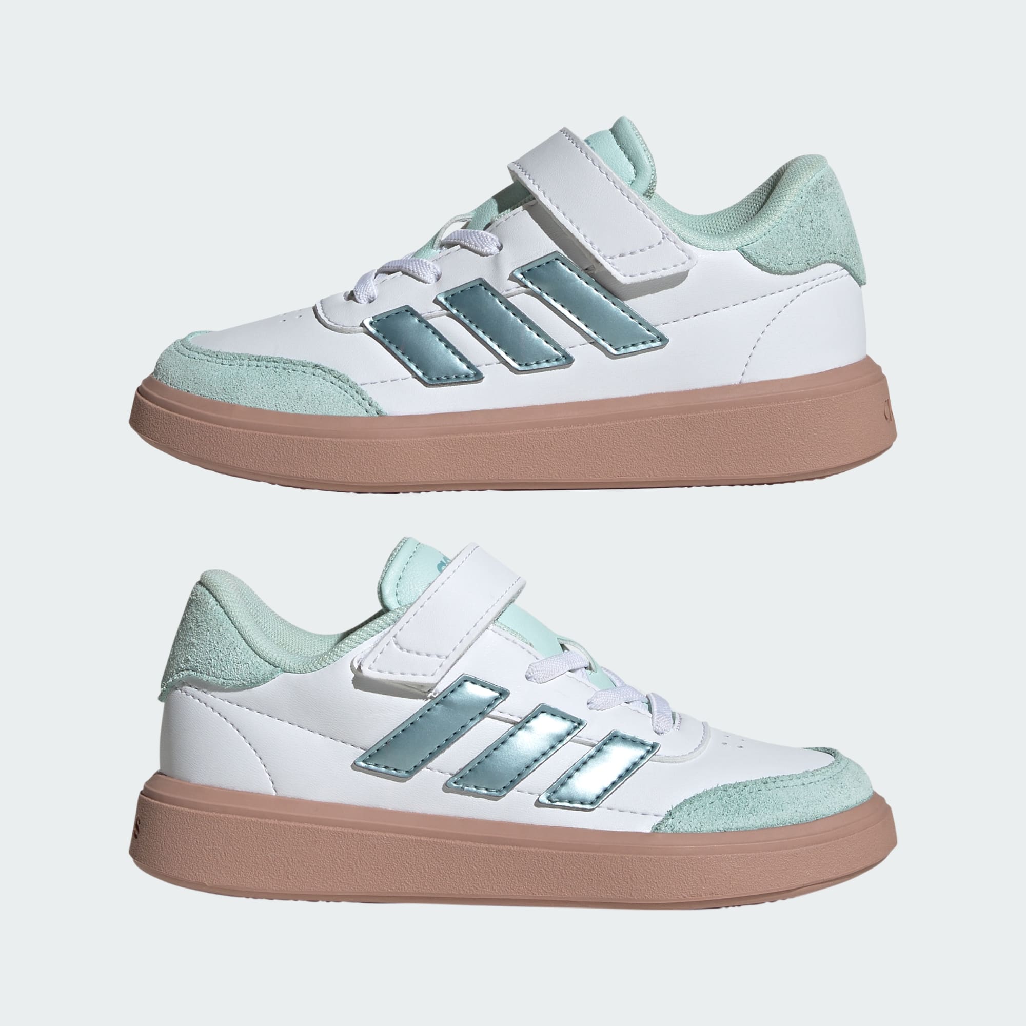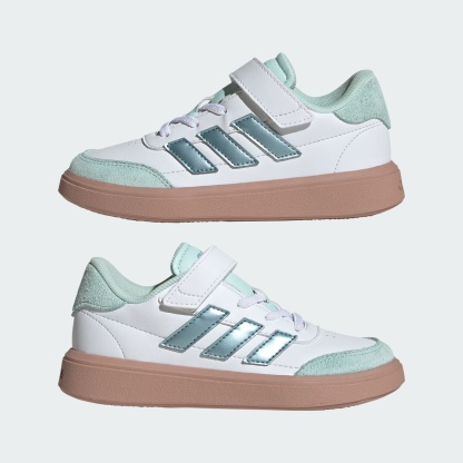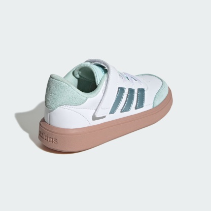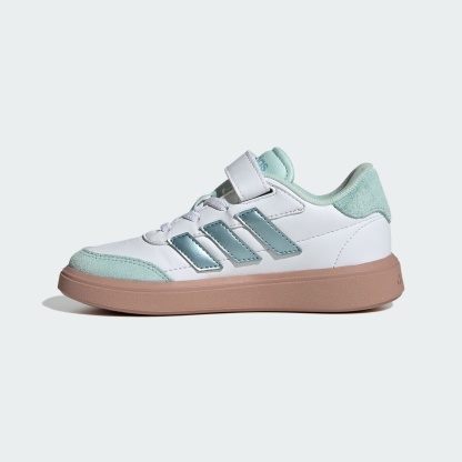 Sleek and sporty kicks for kids who are on the move all day. Made from smooth faux leather upper, these kids' adidas sneakers stand up to regular wear. A soft lining keeps the foot comfortable while a sturdy rubber cupsole provides grip for running, climbing and games of tag. A classic lace-up front, topped off with a hook-and-loop strap, provides a secure fit through all kinds of escapades.