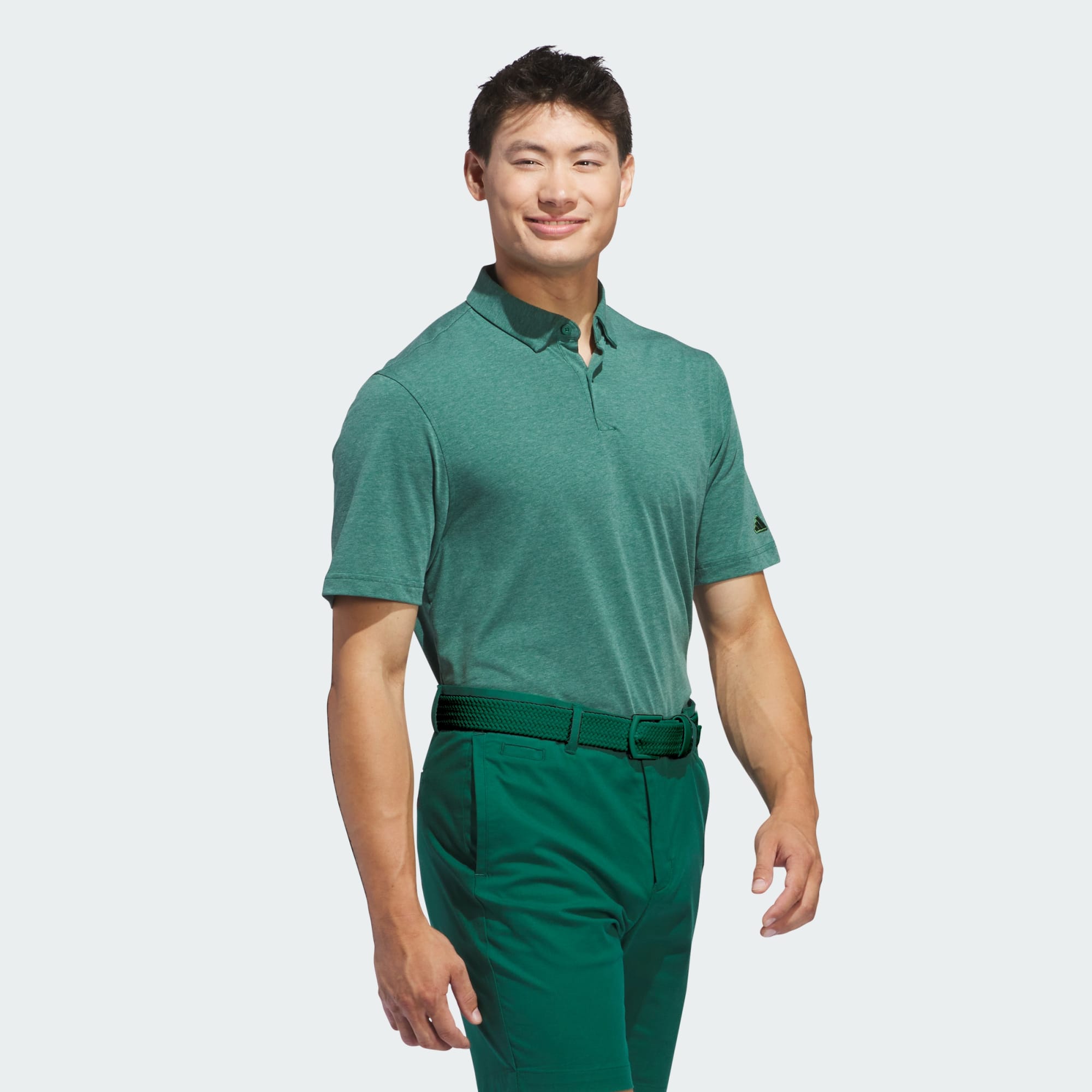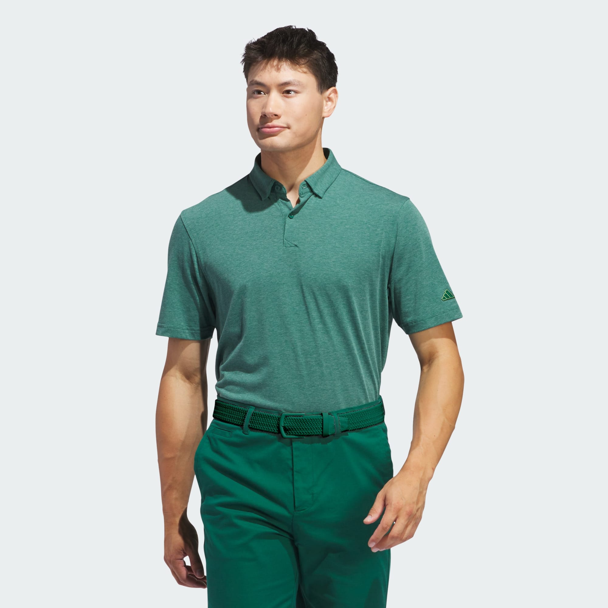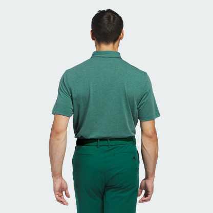 A golf polo shirt with stretch, made in part with recycled materials.