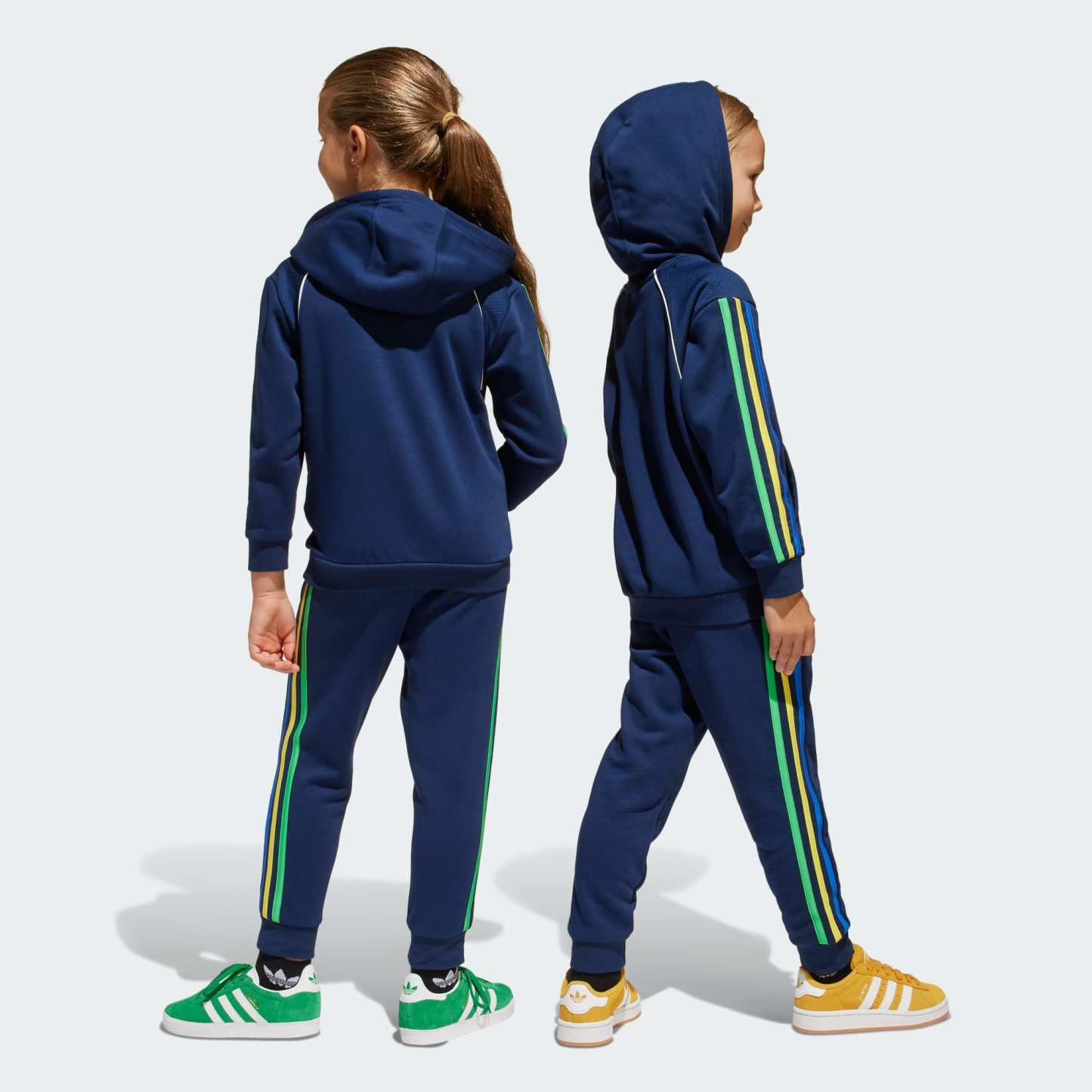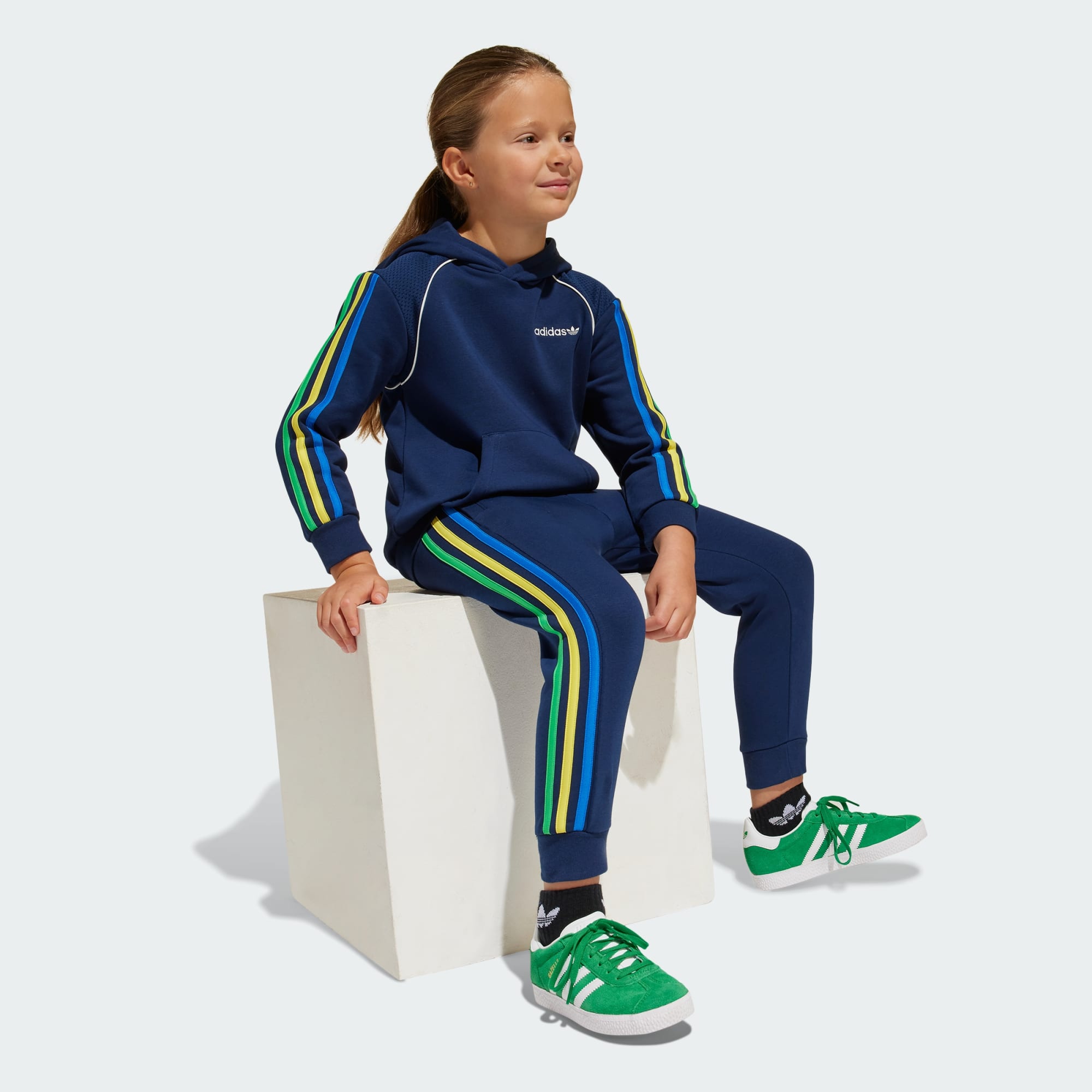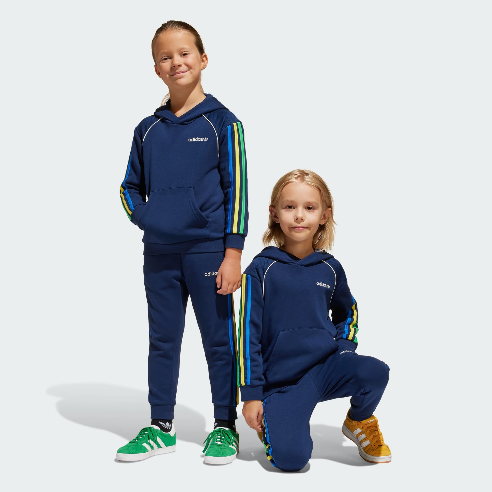 This kids' set from adidas is made from soft French terry fabric with mesh panels on the top for a sporty look. It's loose and casual, with tricolor stripes and contrast piping as a call-back to track suits from the archives. The pants have an easygoing, straight-leg cut.