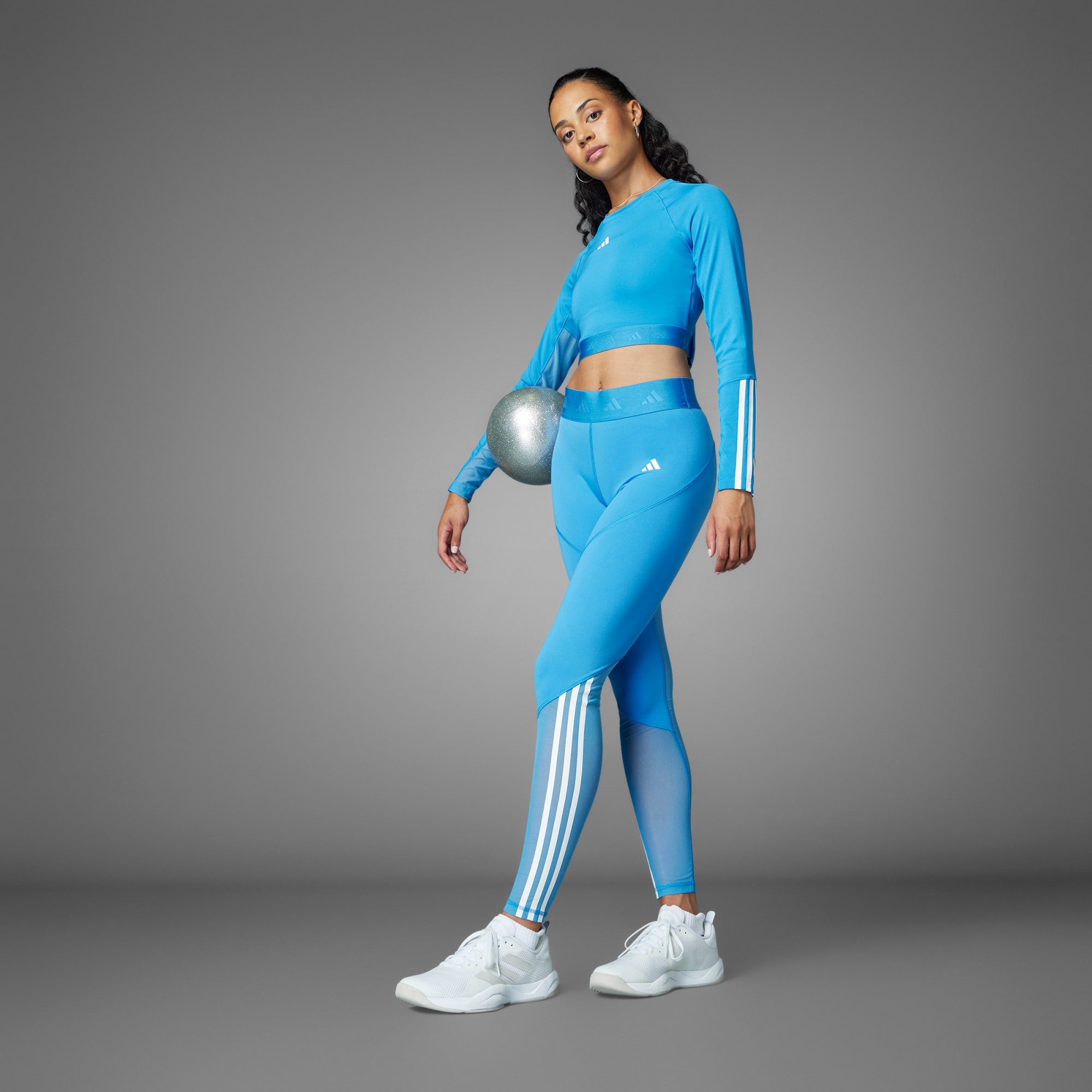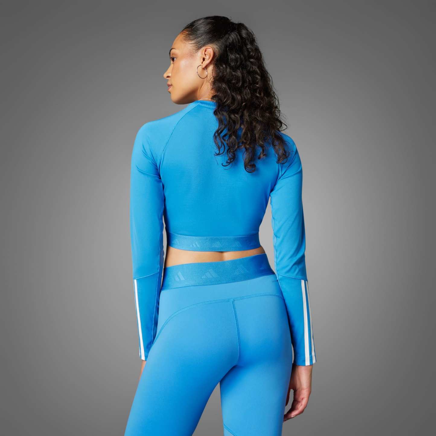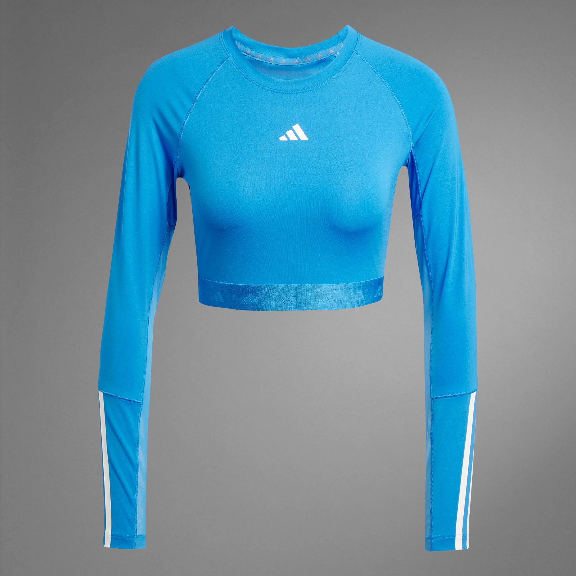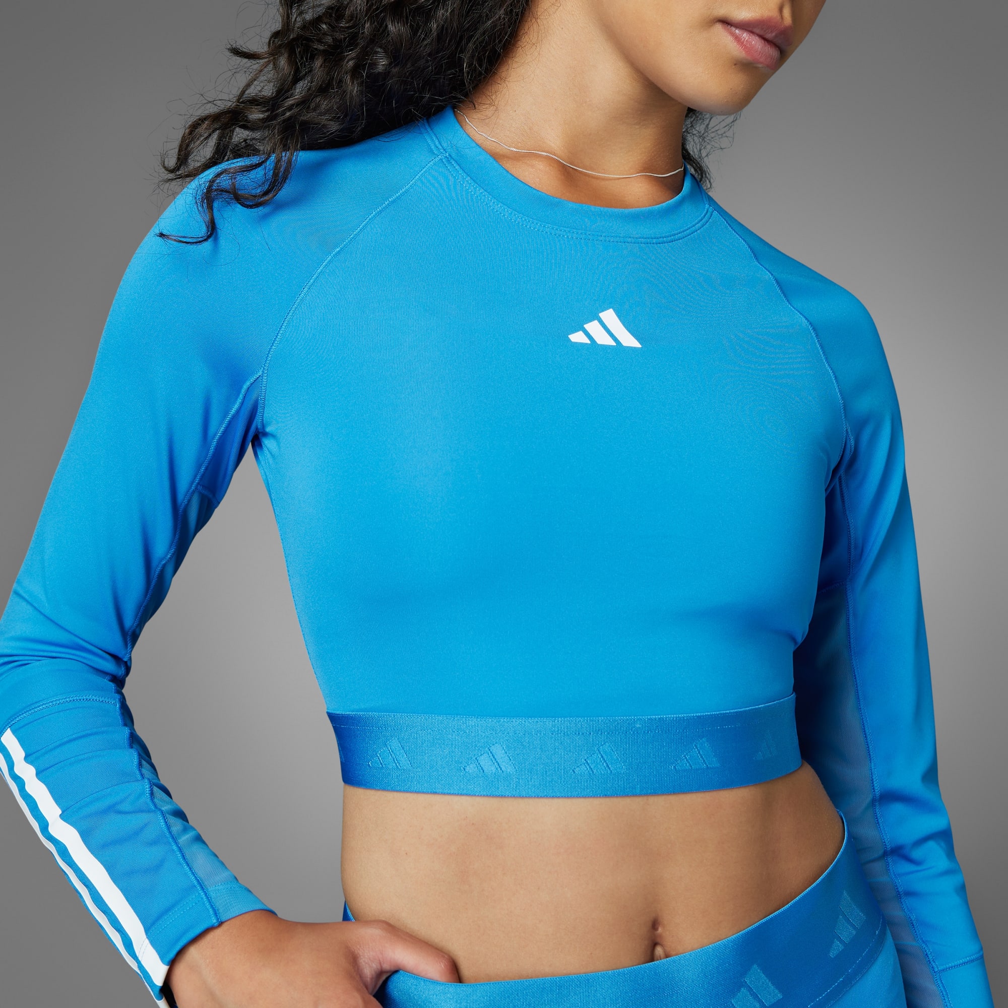 Sporty, but make it cute. That's the philosophy behind this adidas cropped tee. Feel confident pushing through high intensity intervals thanks to moisture-absorbing AEROREADY and mesh panels that add targeted breathability. Long sleeves that show off 3-Stripes give it athletic cred, while the cropped length pairs perfectly with your favorite leggings or shorts. This product is made with at least 70% recycled materials. By reusing materials that have already been created, we help to reduce waste and our reliance on finite resources and reduce the footprint of the products we make.