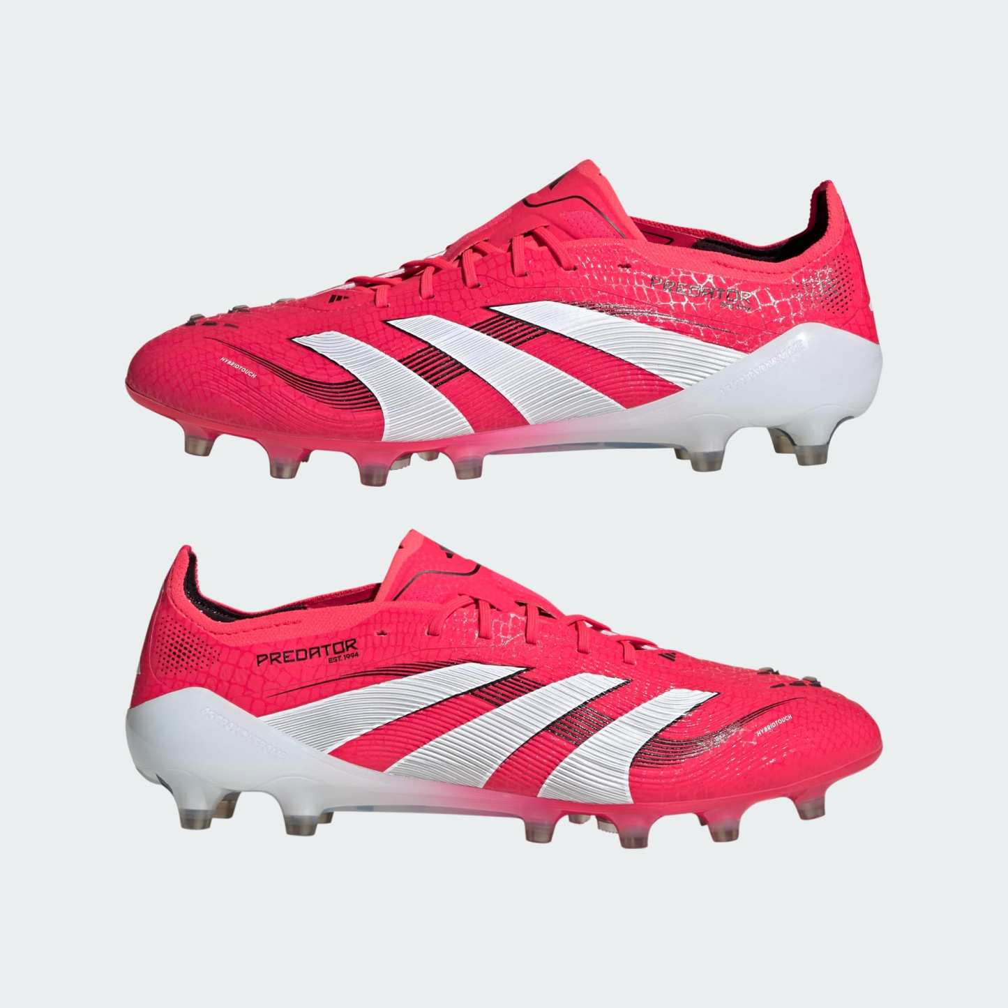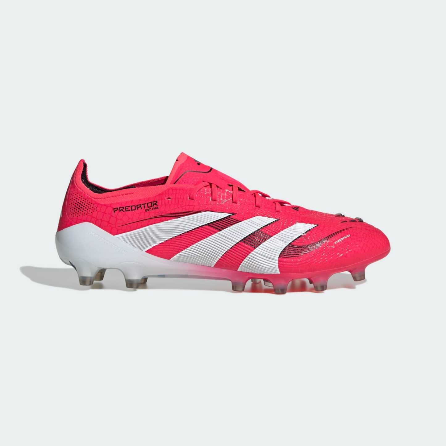Go into every game knowing you'll score in adidas Predator Elite cleats crafted for goals. With strategically placed rubber Strikeskin fins on its forefoot, the flexible HybridTouch upper is designed to help you make perfect contact with the soccer. That Traxionframe artificial grass outsole and adidas PRIMEKNIT collar are all about keeping you stable as you zero in on your target.
