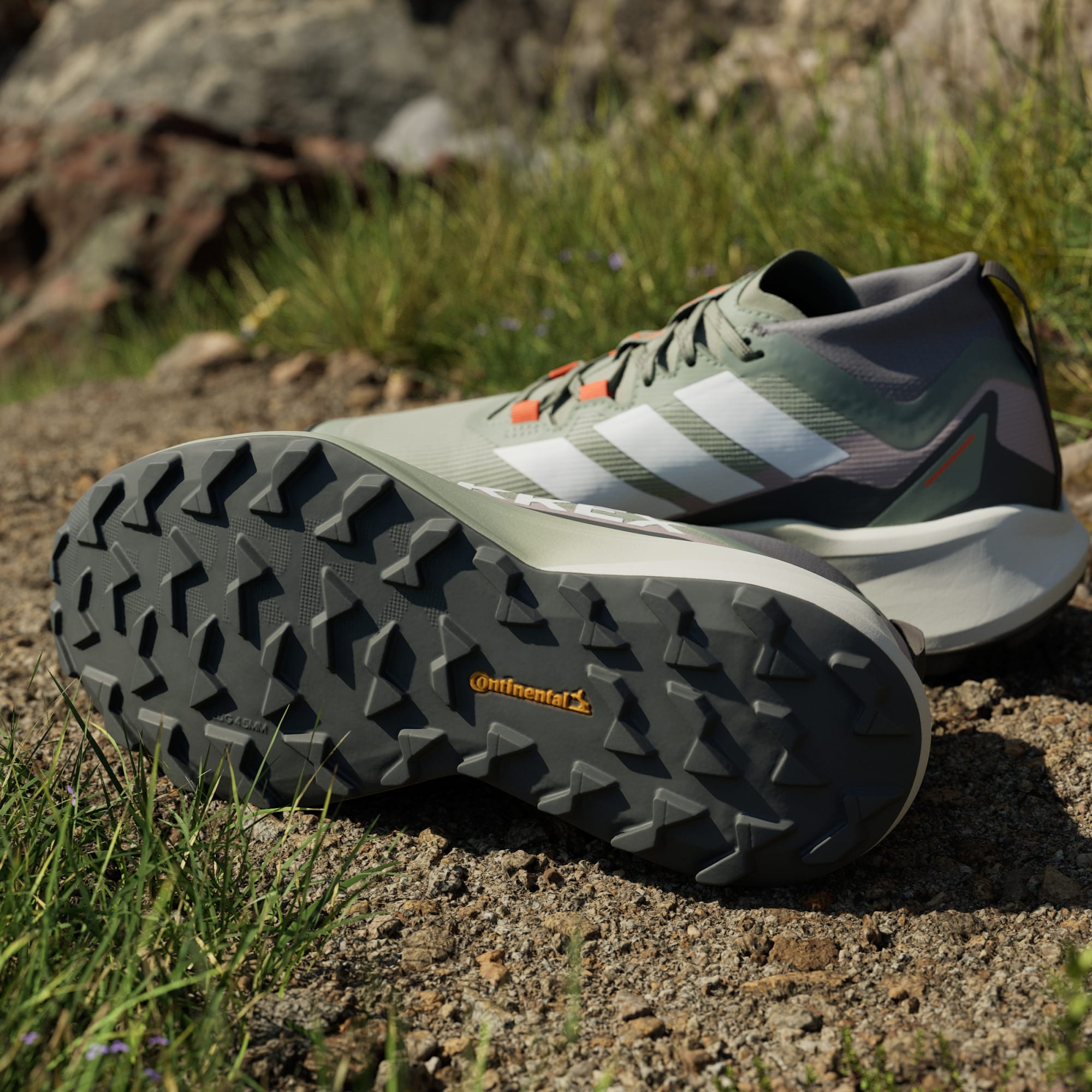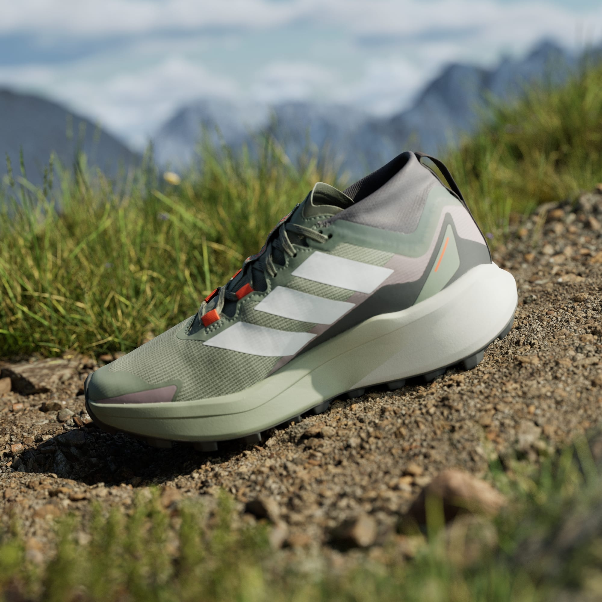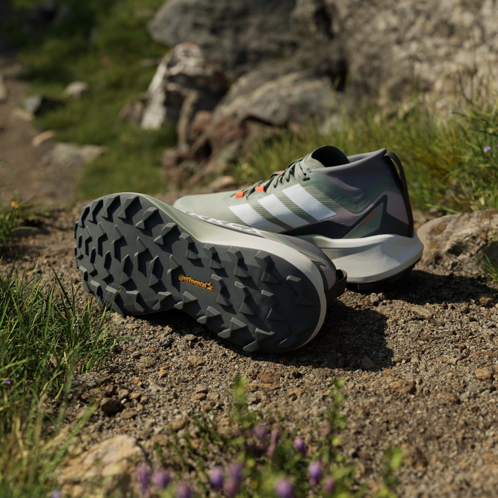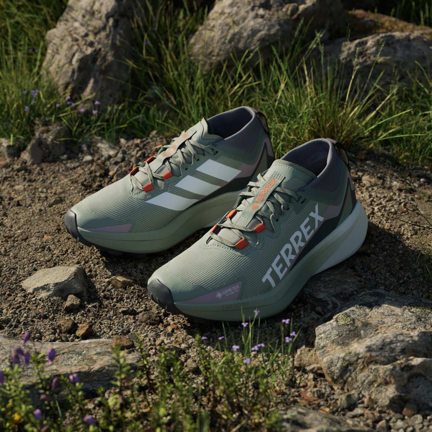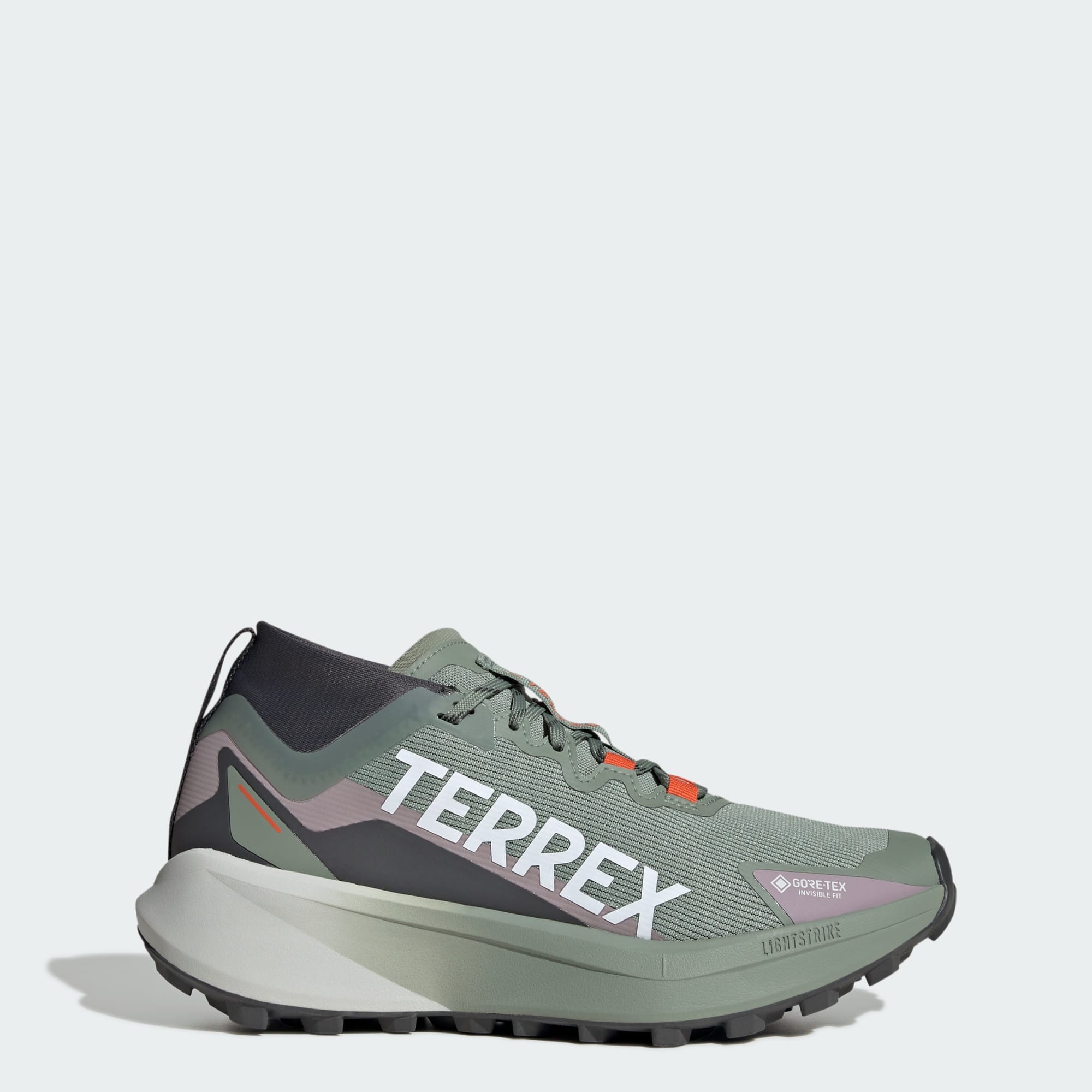Responsive and supportive, these Terrex Agravic trail running shoes are built for logging miles and adventurous days on the trail in wet, muddy conditions. A waterproof, breathable GORE-TEX membrane seals out wet conditions to keep your feet dry, and you focused on the trail ahead. Abrasion-resistant overlays add trail-proven durability, and the gusseted tongue seals out debris. A Lightstrike 2.0 midsole provides responsive cushioning for stability and comfort on rough terrain, and the rocker shape promotes a smooth roll-off for a fluid pace. The Continental邃「 Rubber outsole with 4 mm lugged tread maintains secure footing across roots and rocks, wet or dry.This product features at least 20% recycled materials. By reusing materials that have already been created, we help to reduce waste and our reliance on finite resources and reduce the footprint of the products we make.