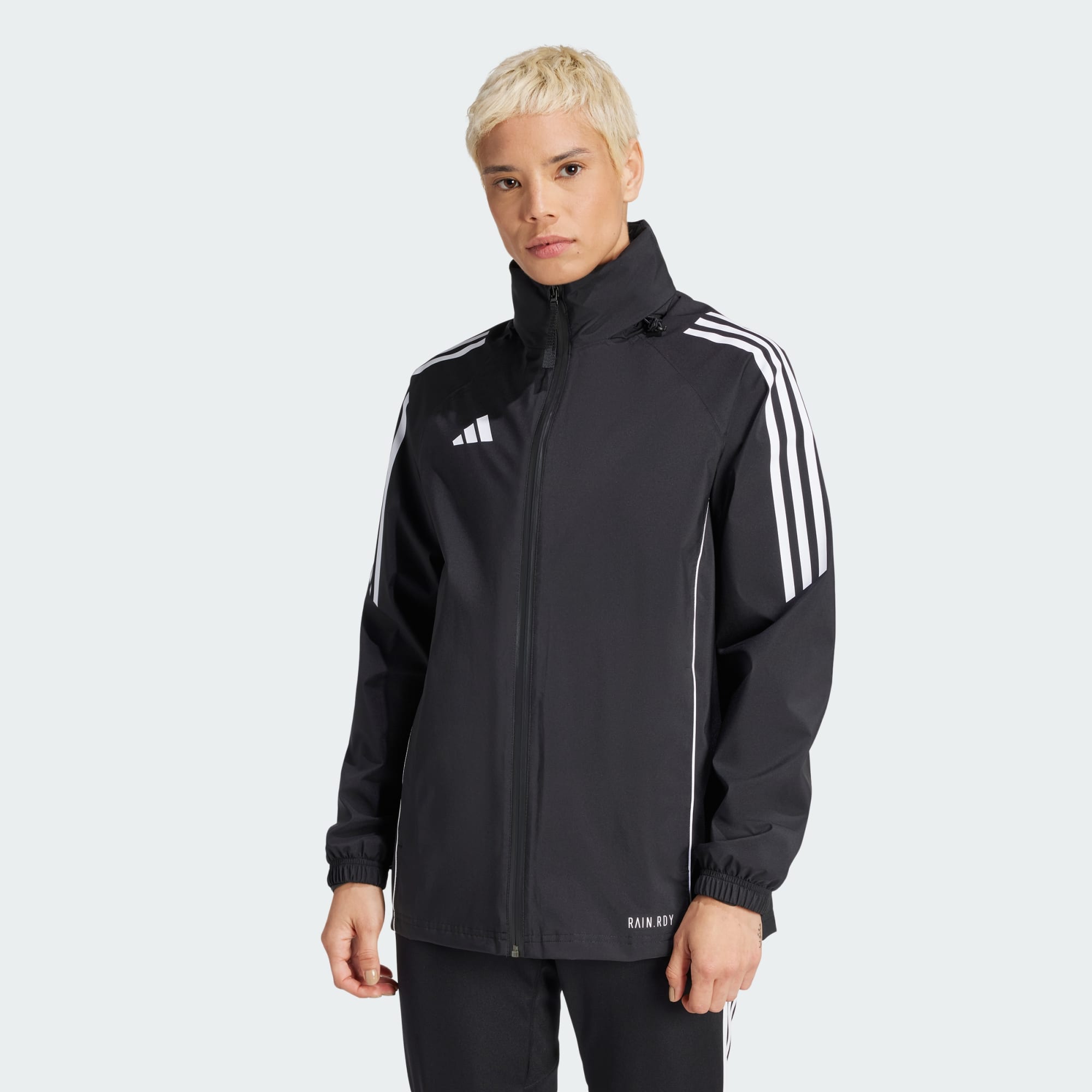 Take on the elements during soccer training in this adidas Tiro 24 jacket. When the wind and rain threaten to ruin your session, stay focused thanks to waterproof RAIN.RDY and the soft mesh lining. Then, once the worst is over, you can simply pack away the hood and get back to dominating every drill.This product is made with at least 70% recycled materials. By reusing materials that have already been created, we help to reduce waste and our reliance on finite resources and reduce the footprint of the products we make.