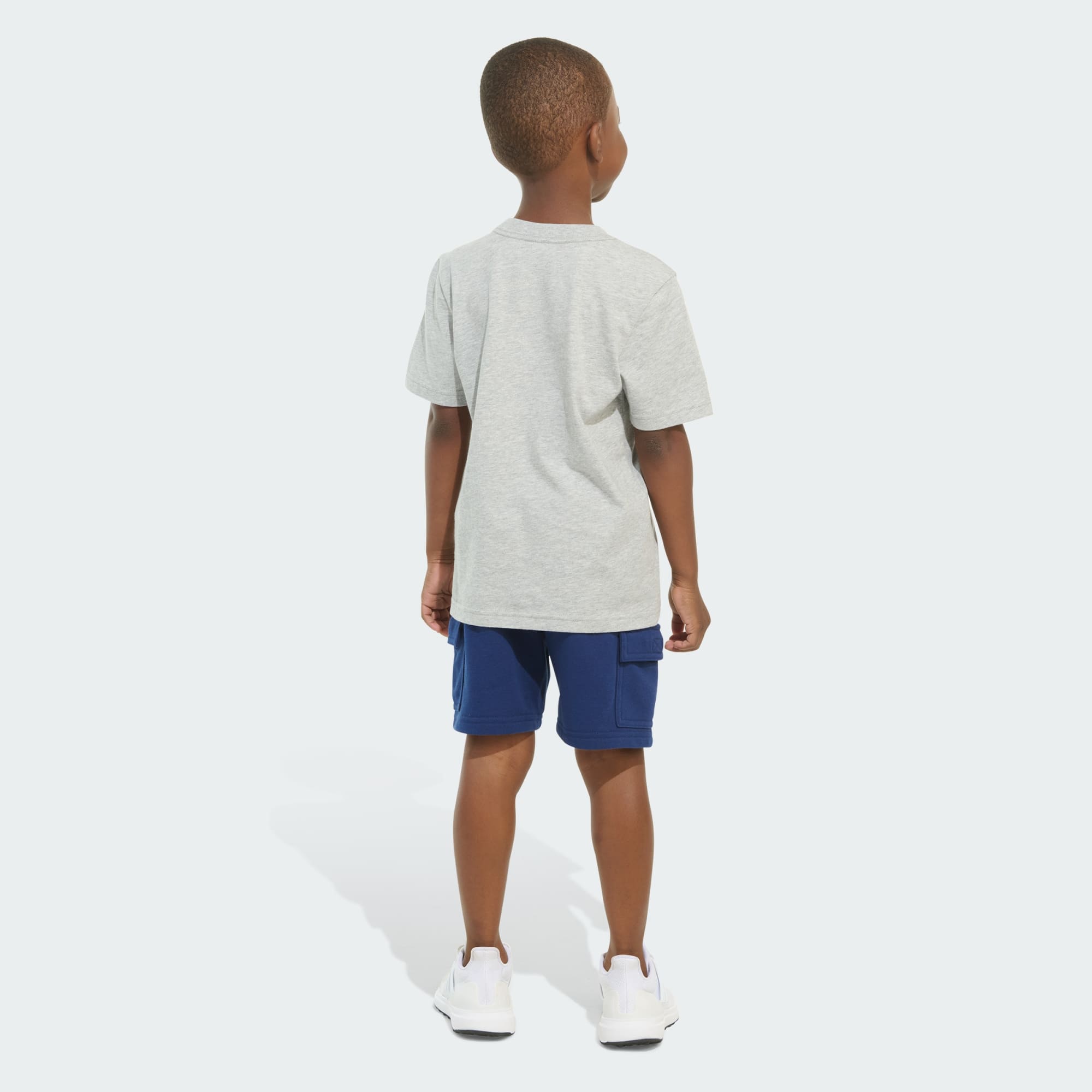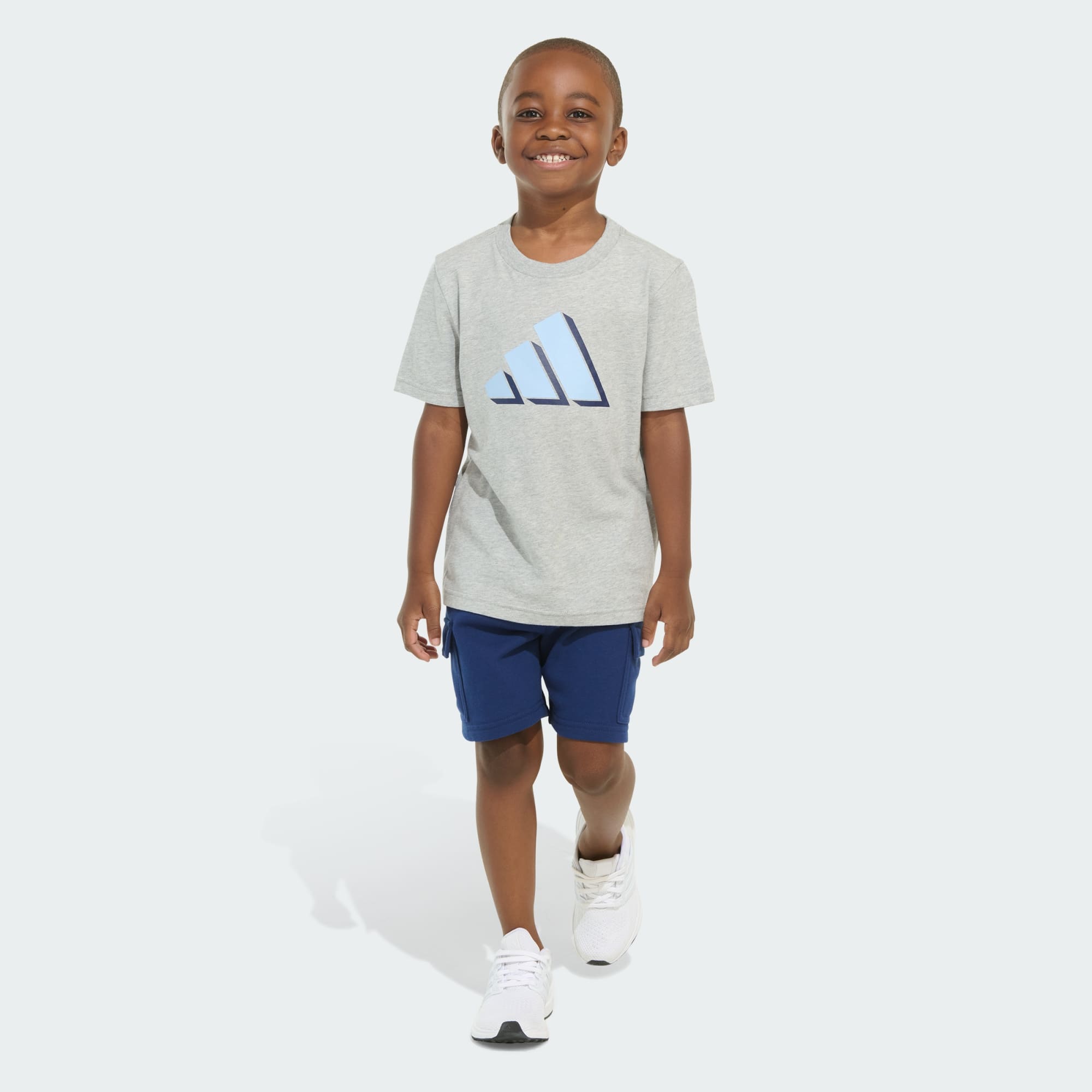 For young athletes who love to run, play and explore, this two-piece set from adidas is a win for comfort and sporty style. Made from fabrics that are soft and easy to clean, the set comes with a regular crewneck tee with a big, bold logo and a pair of matching cargo shorts.