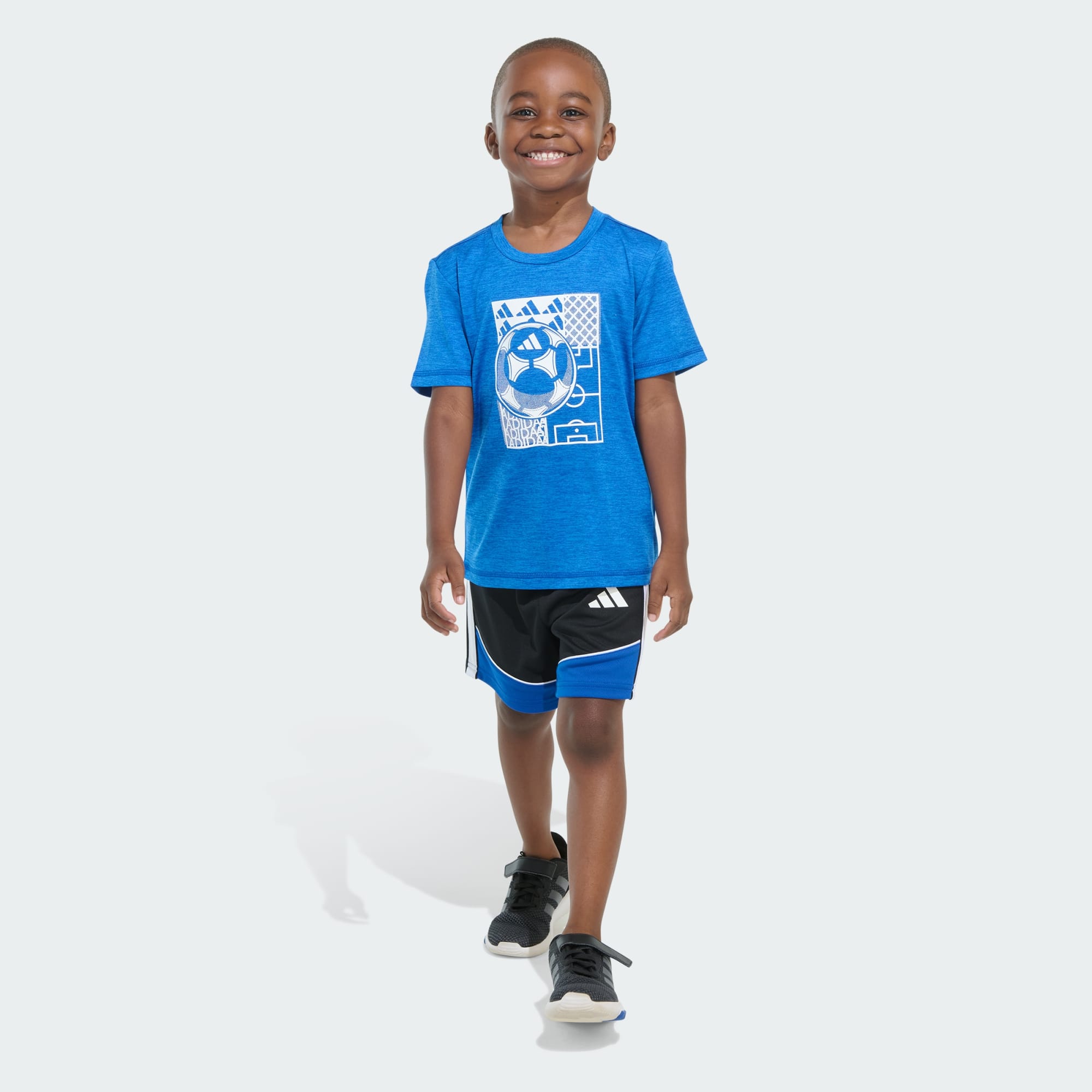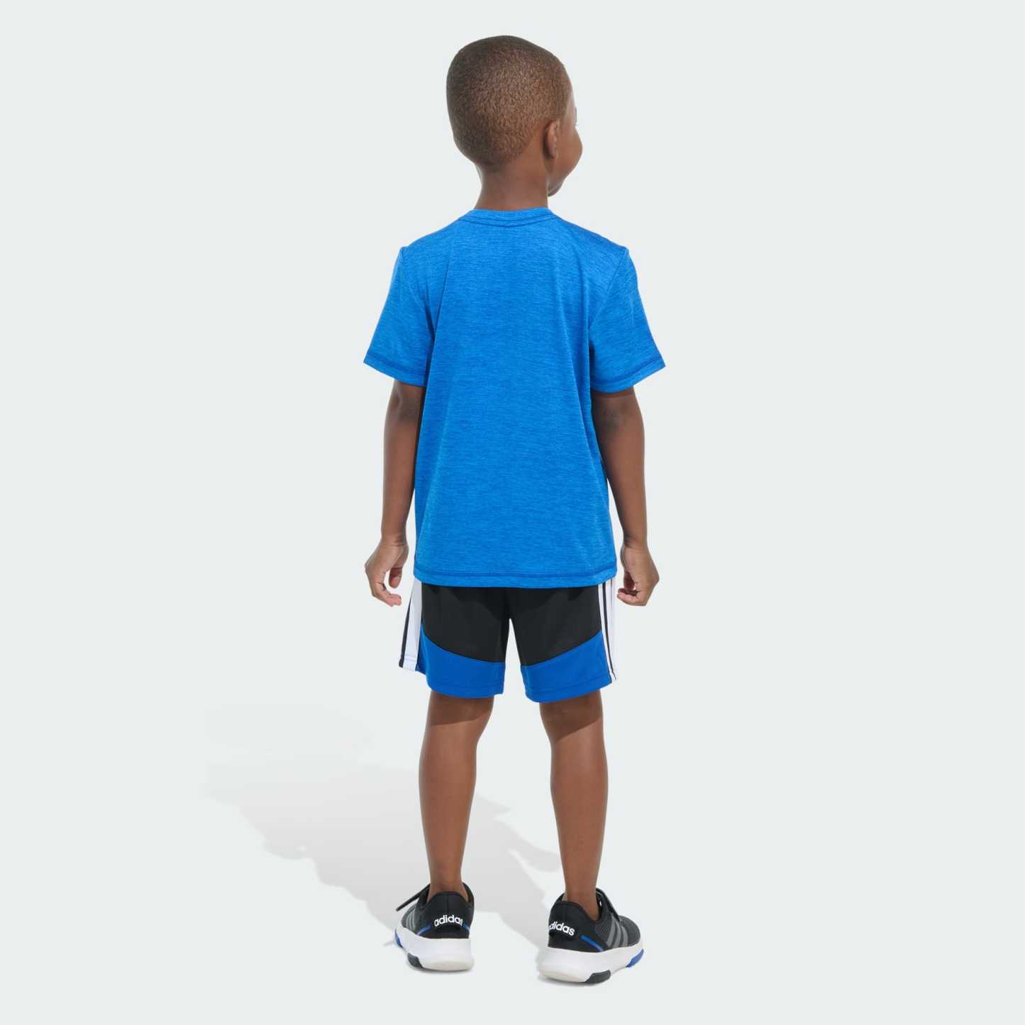 For little ones who are all about sports, this two-piece adidas set is an easy victory. Made from fabrics that are soft and easy to clean, the set includes a regular crewneck tee and matching pair of shorts with cool colors and 3-Stripes along the sides.
