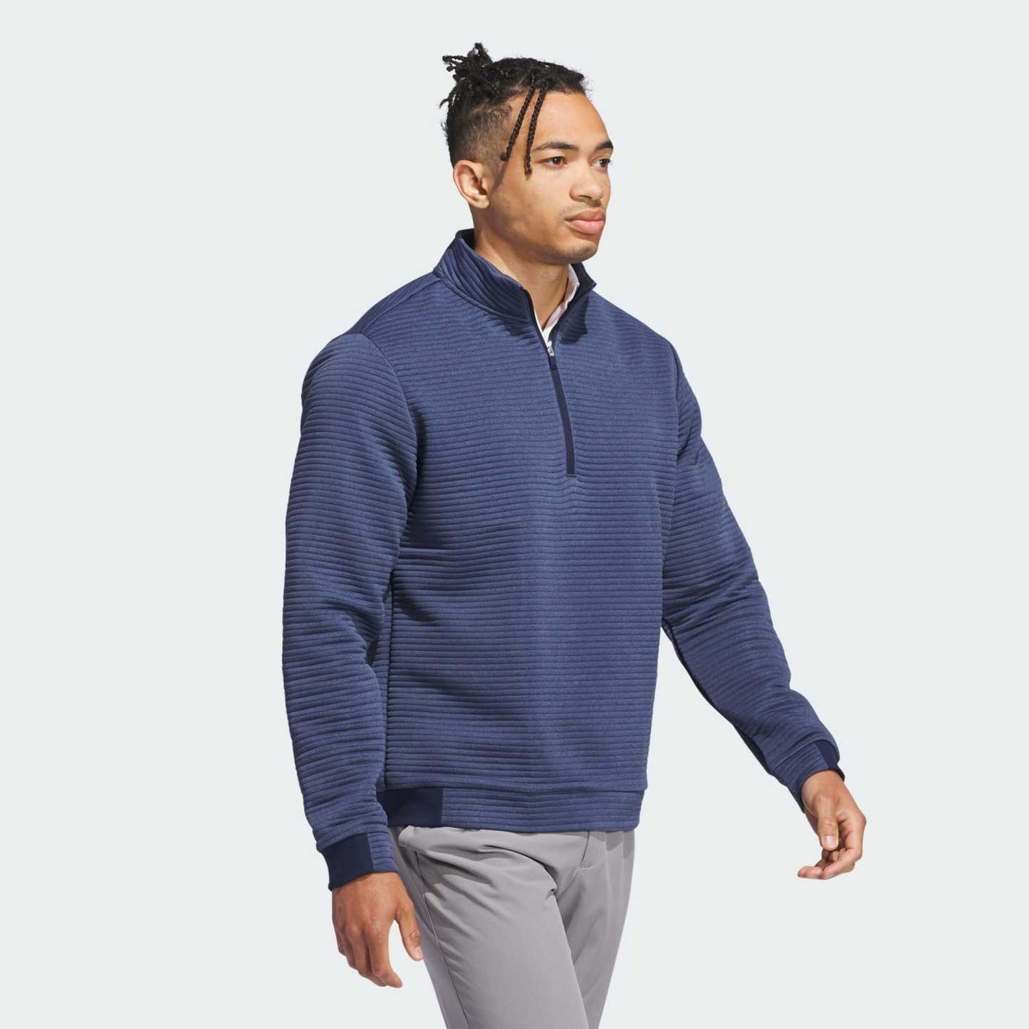 Tee off in cool weather with confidence. This Ultimate365 golf pullover from adidas adds warmth without weighing you down thanks to textured jacquard. Ribbed details add mobility while a water-repellent finish resists moisture to keep you playing through occasional showers. The quarter zip lets you adjust the ventilation as needed.